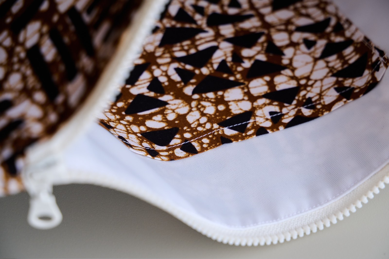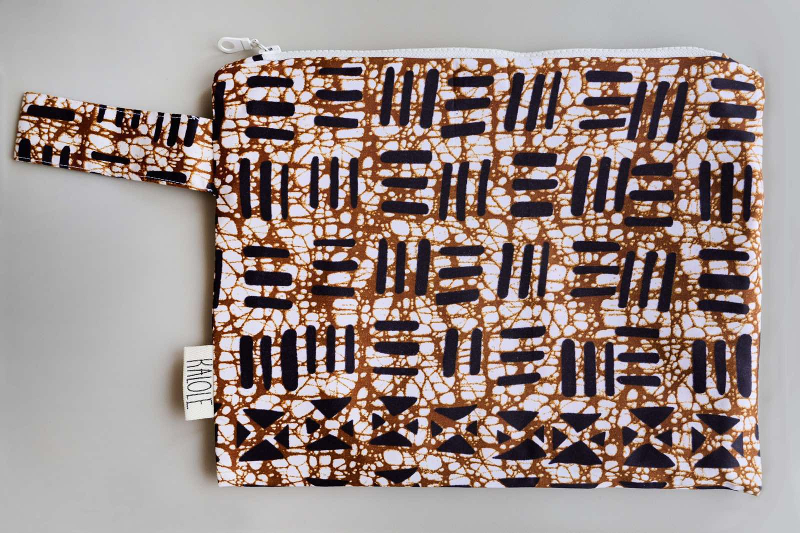Χειροποίητο Αδιάβροχο Τσαντάκι (veritable wax block prints) με εσωτερική αδιάβροχη επένδυση, εσωτερική θήκη για το κινητό, βολική λαβή καρπού και κλείσιμο με πλαστικό φερμουάρ στο επάνω μέρος.